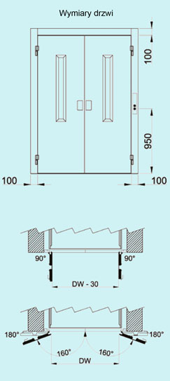 Drzwi przystankowe: wychylne ręczne o wykończeniu ze stali lakierowanej RAL7038 jedno lub dwuskrzydłowe, z oknem 70 x 900 mm. Dostępne EI60 i EI120.